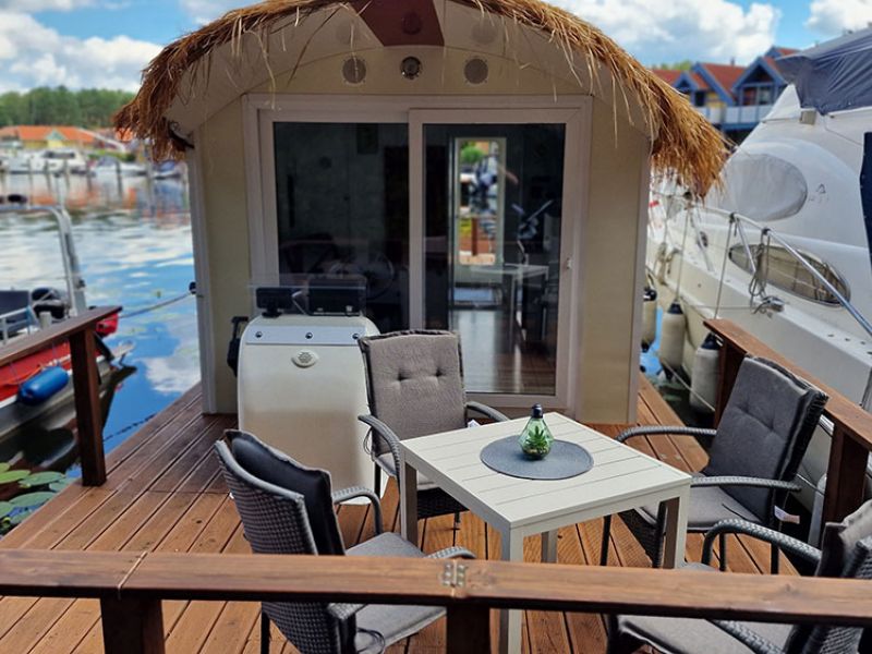 Auf der Terrasse der „Calypso“ findest du Terrassenmöbel, darunter ein Tisch und vier Stühle. Perfekt, um im Freien zu speisen und die vorbeiziehende Landschaft zu bewundern. Wenn du Lust auf noch mehr Abenteuer hast, kannst du optional auch ein SUP-Board hinzubuchen und den Fluss auf ganz neue Art erkunden.