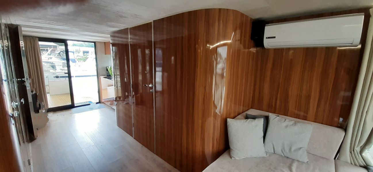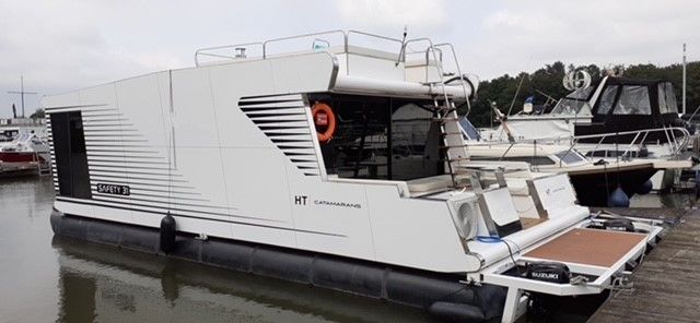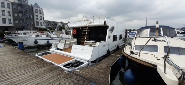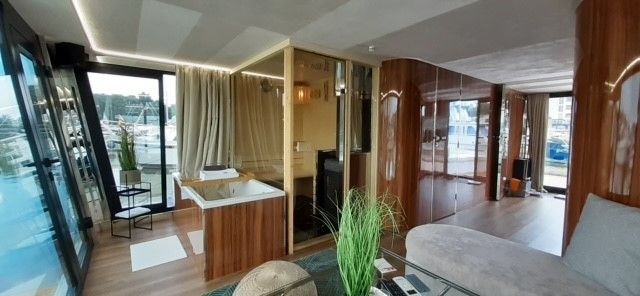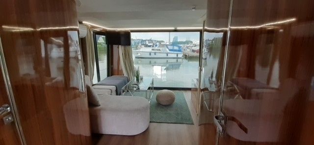 Das Hausboot ist vollständig ausgestattet WC (elektr. Häcksler-Toilette), Waschbecken, separater Dusche, Küchenzeile mit Spüle, zwei Gaskochfeldern und Kühlschrank, Sitzgruppe, Einbauschrank und einem Fernseher. Dank der Rundumverglasung können Sie von überall im Hausboot aus umwerfende Blicke auf das Wasser und die Landschaft genießen! Die besonderen Highlights des Hausboots erwarten Sie im Außenbereich: die Heckterrasse ist mit einer modernen Außenküche mit Kühlschrank, Kochfeldern und Spüle ausgestattet, sodass Sie hier bei gutem Wetter an der frischen Luft kochen und essen können. Vom Heck des Hausboots aus führt eine Außentreppe auf das Dach, wo sich eine herrliche Dachterrasse über den kompletten Wohnbereich erstreckt.